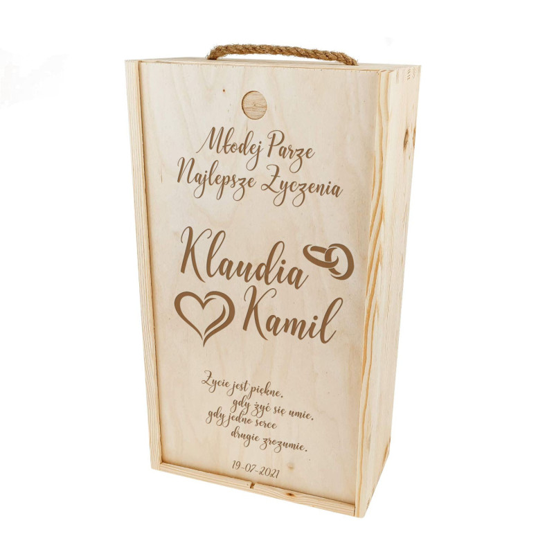 Idealnie sprawdzi się jako prezent od młodej pary. Pomieści butelki wina, wódki oraz kieliszki o poj. ok. 300 ml. Na wieczku wygrawerujemy piękne, personalizowane życzenia. Skrzyneczkę wypełnimy wełną drzewną, co doda jej elegancji i stworzy wyściółkę dla zapakowanego szkła.