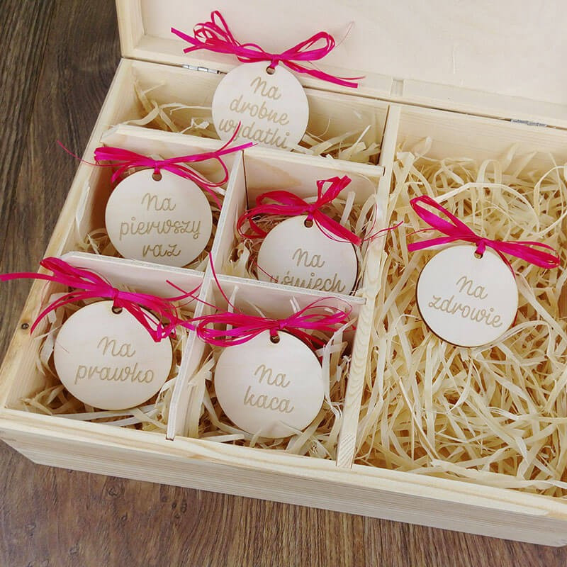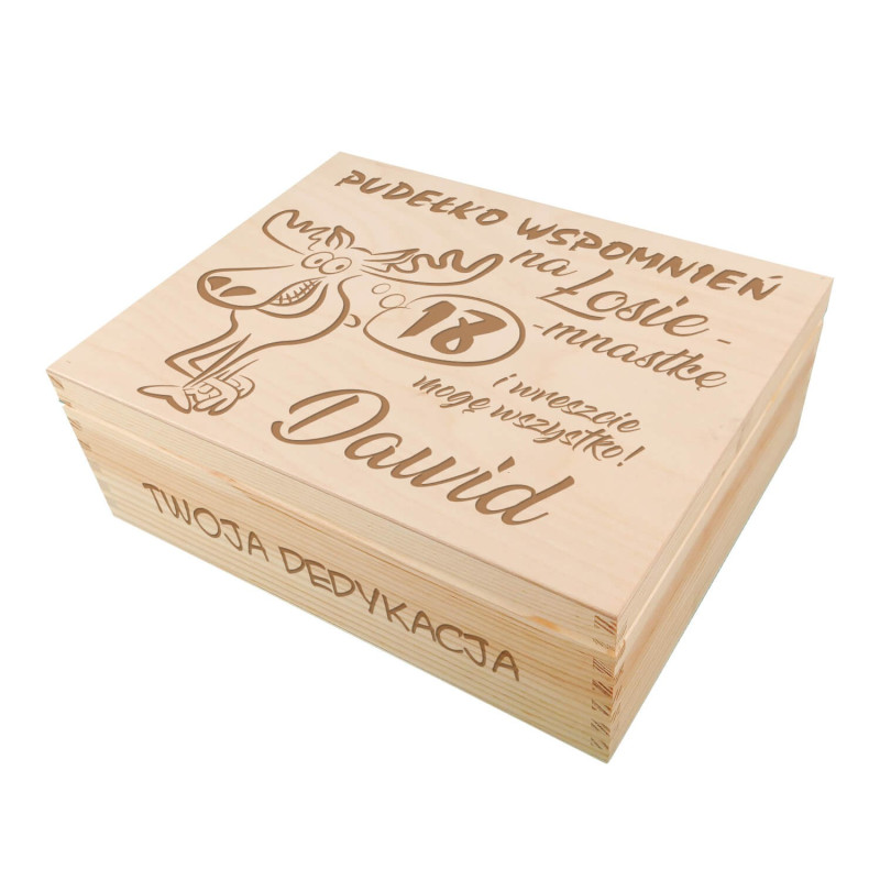 Świetna szkatułka na 18-ste urodziny. Na wieczku życzenia. Wewnątrz przegródki do umieszczenia śmiesznych przedmiotów związanych z wejściem w pełnoletność. Pudełko wyścielone jest wiórkami drzewnymi. Etykietki drewniane mają zawiązane słodkie kokardki różowe, bądź naturalne - wyboru dokonasz w zakładce PERSONALIZACJA PRODUKTU.