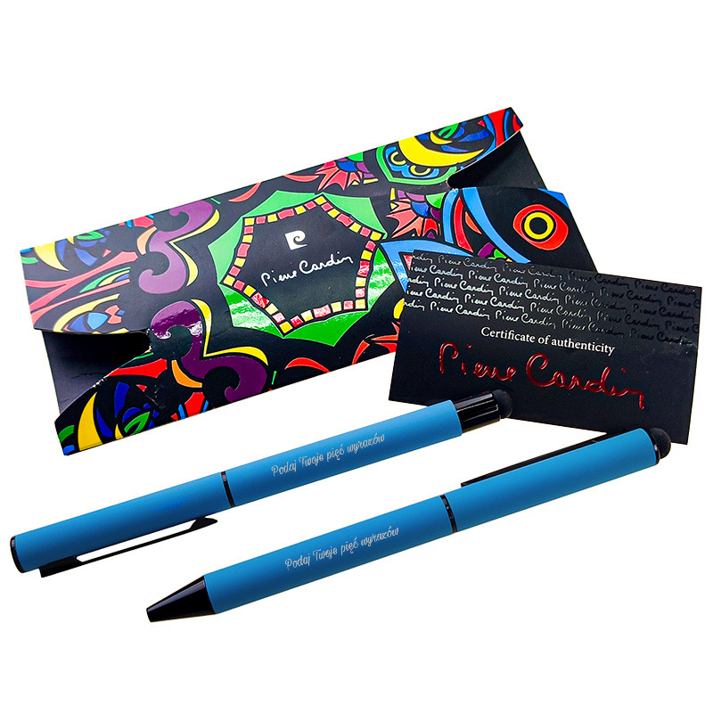 Zestaw piśmienny w modnych, intensywnych kolorach, składający się z długopisu oraz pióra kulkowego. Obydwa artykuły posiadają przyjemną w dotyku powierzchnię soft touch i czarne detale oraz funkcję touch pen. Długopis wyposażony w niebieski wkład (0,7 mm), a pióro kulkowe w niemiecki wkład Schneider piszący na niebiesko (0,5 mm). Całość zapakowana w eleganckie etui prezentowe z certyfikatem autentyczności Pierre Cardin. Dodatkowo taki zestaw może okazać się świetnym prezentem, np. z okazji zdania ważnego egzaminu itd. Jeśli wybrałeś opcję z personalizacją podaj tekst (maksymalnie 4 słowa), który mamy umieścić na produktach.