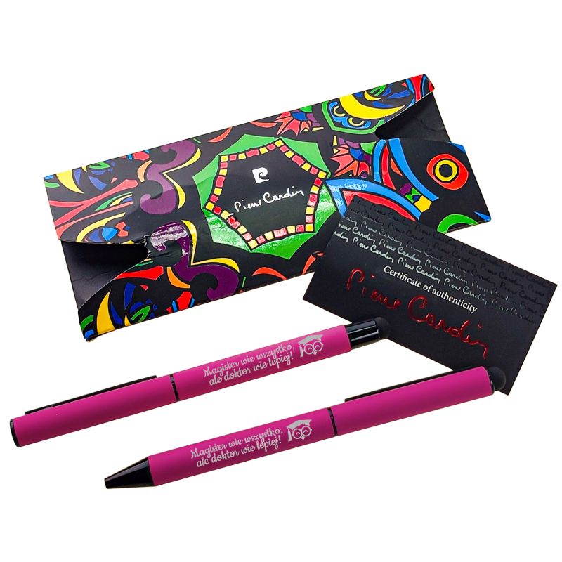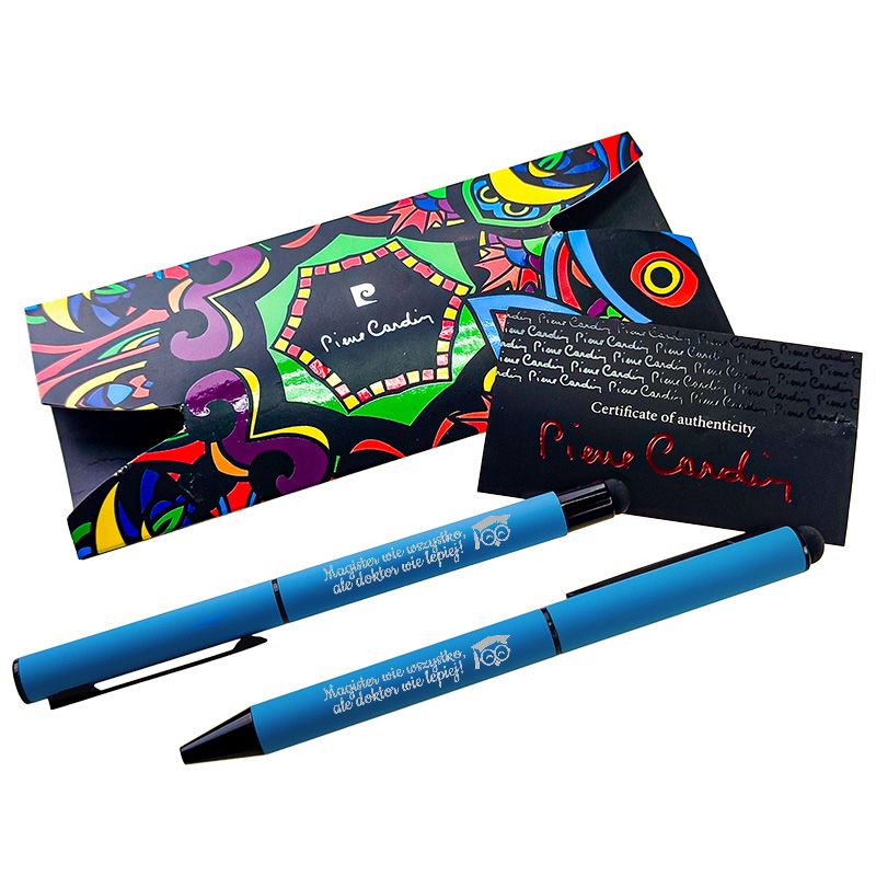 Zestaw piśmienny w modnych, intensywnych kolorach, składający się z długopisu oraz pióra kulkowego. Obydwa artykuły posiadają przyjemną w dotyku powierzchnię soft touch i czarne detale oraz funkcję touch pen. Długopis wyposażony w niebieski wkład (0,7 mm), a pióro kulkowe w niemiecki wkład Schneider piszący na niebiesko (0,5 mm). Całość zapakowana w eleganckie etui prezentowe z certyfikatem autentyczności Pierre Cardin. Dodatkowo taki zestaw może okazać się świetnym prezentem, np. z okazji zdania ukończenia doktoratu.