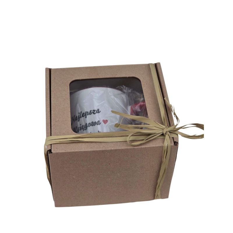 Eleganckie i ekologiczne pudełko prezentowe, idealne do zapakowania kubka na prezent. Wykonane z naturalnej tektury, z przezroczystym okienkiem, przez które pięknie widać zawartość – bez konieczności otwierania. Przewiązane dekoracyjną naturalną rafią, która nadaje mu wyjątkowego uroku.