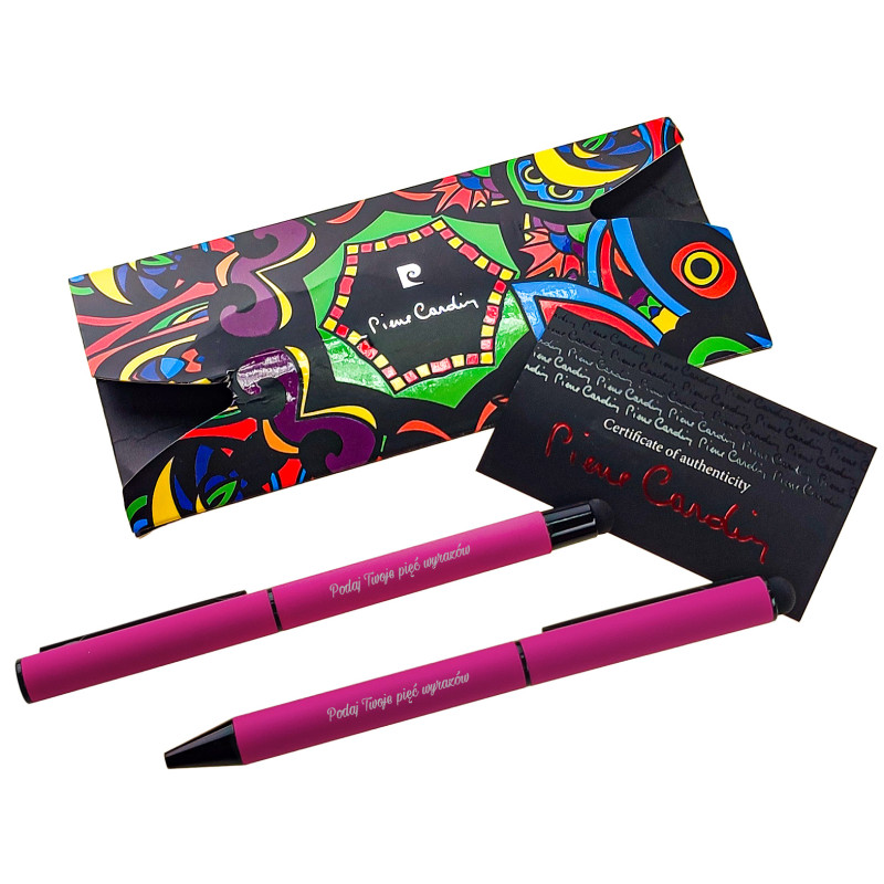 Zestaw piśmienny w modnych, intensywnych kolorach, składający się z długopisu oraz pióra kulkowego. Obydwa artykuły posiadają przyjemną w dotyku powierzchnię soft touch i czarne detale oraz funkcję touch pen. Długopis wyposażony w niebieski wkład (0,7 mm), a pióro kulkowe w niemiecki wkład Schneider piszący na niebiesko (0,5 mm). Całość zapakowana w eleganckie etui prezentowe z certyfikatem autentyczności Pierre Cardin. Dodatkowo taki zestaw może okazać się świetnym prezentem, np. z okazji zdania ważnego egzaminu itd. Jeśli wybrałeś opcję z personalizacją podaj tekst (maksymalnie 4 słowa), który mamy umieścić na produktach.