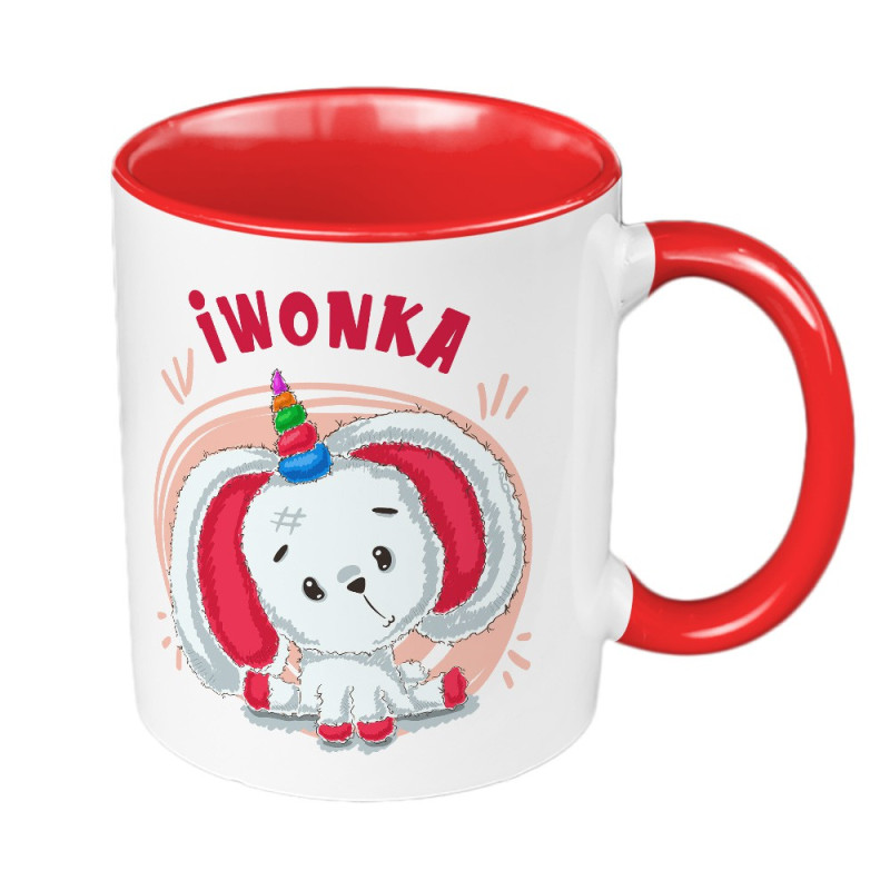 Kubek 330 ml kolorowy z imieniem dla dziecka z grafiką "Królik - jednorożec" - zmień imię.
