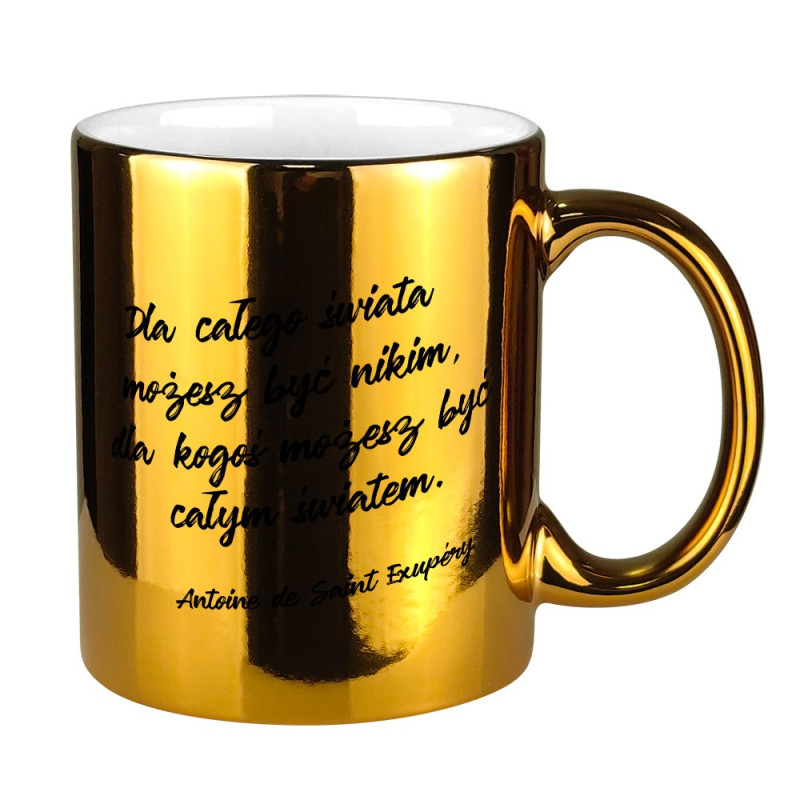 Złoty kubek specjalnie dla dla niej z napisem - "Dzień dobry Piękna" oraz cytatem - "Dla całego świata możesz być nikim, dla kogoś możesz być całym światem".