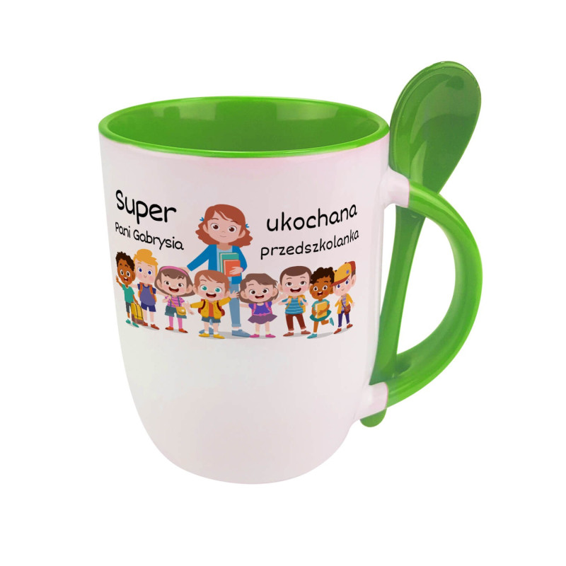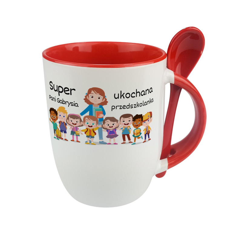 Kubek z łyżeczką dla nauczycielki w przedszkolu - personalizacja.