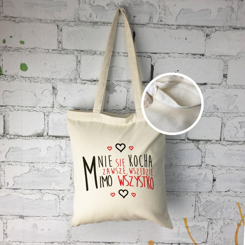Świetna bawełniana torba na zakupy, siłownię lub inne wyjście, zapinana na zamek, z długim uszkiem idealna na ramię, wykonana z naturalnego materiału. Przyjemna w dotyku, wytrzymała, z kieszenią w środku.