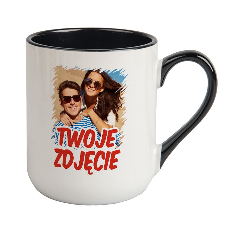 Kubek kawowy duży 330ml z kolorowym uszkiem i środkiem- czarny- z Twoim zdjęciem, grafiką lub tekstem.
