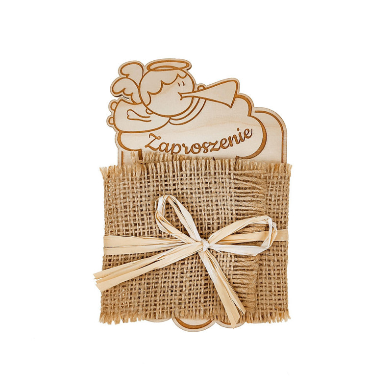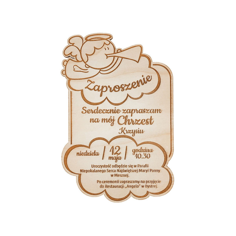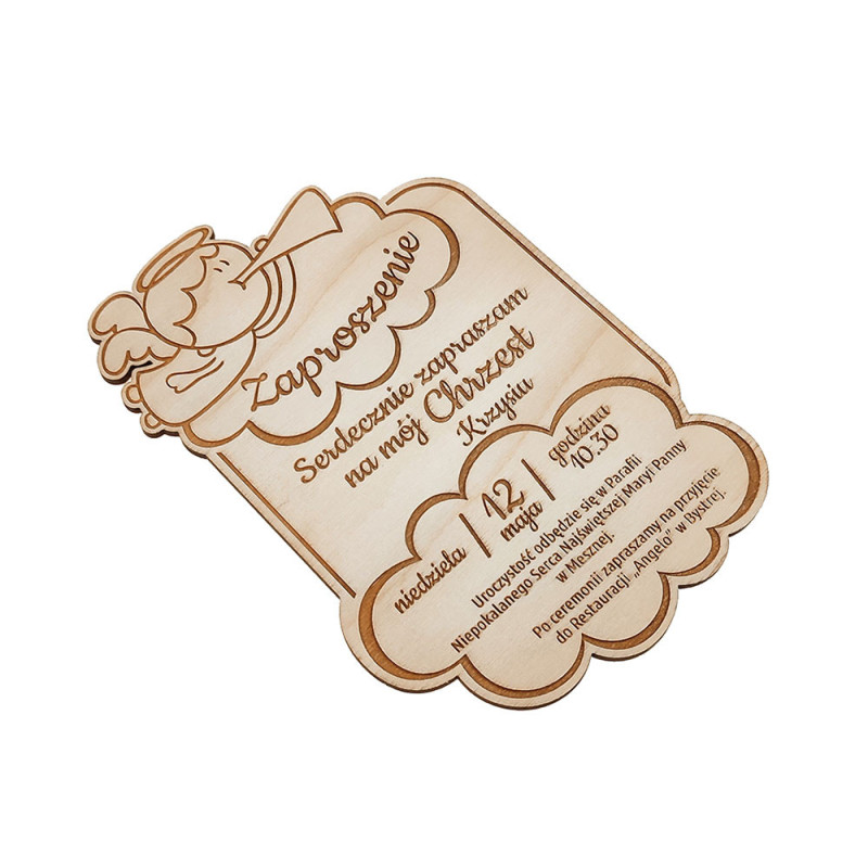 Zaproszenie ze sklejki - chrzest, komunia (aniołek).