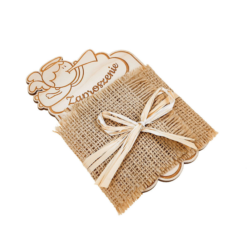 Eleganckie drewniane zaproszenie na chrzest lub komunię.