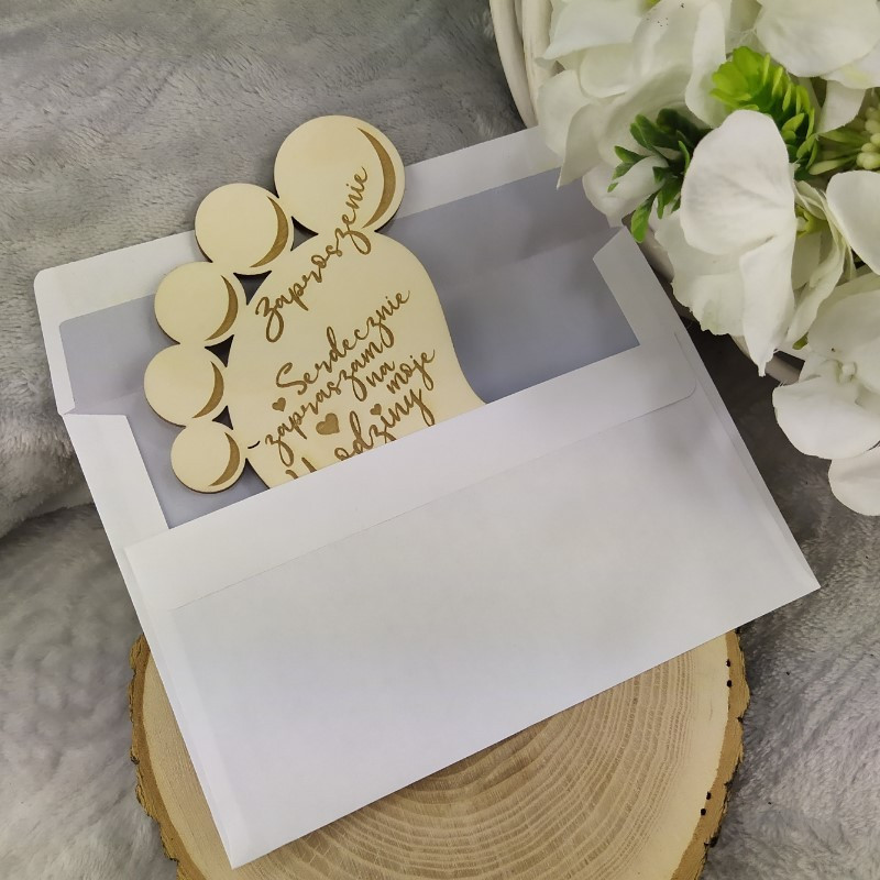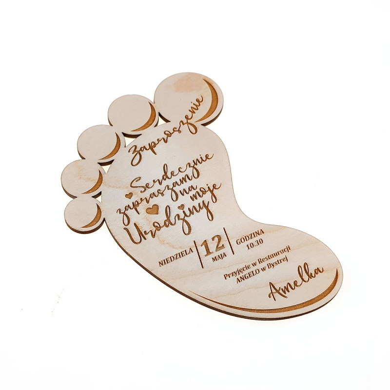 Zaproszenie na roczek, urodziny - ze sklejki, grawerowane (stópka).
