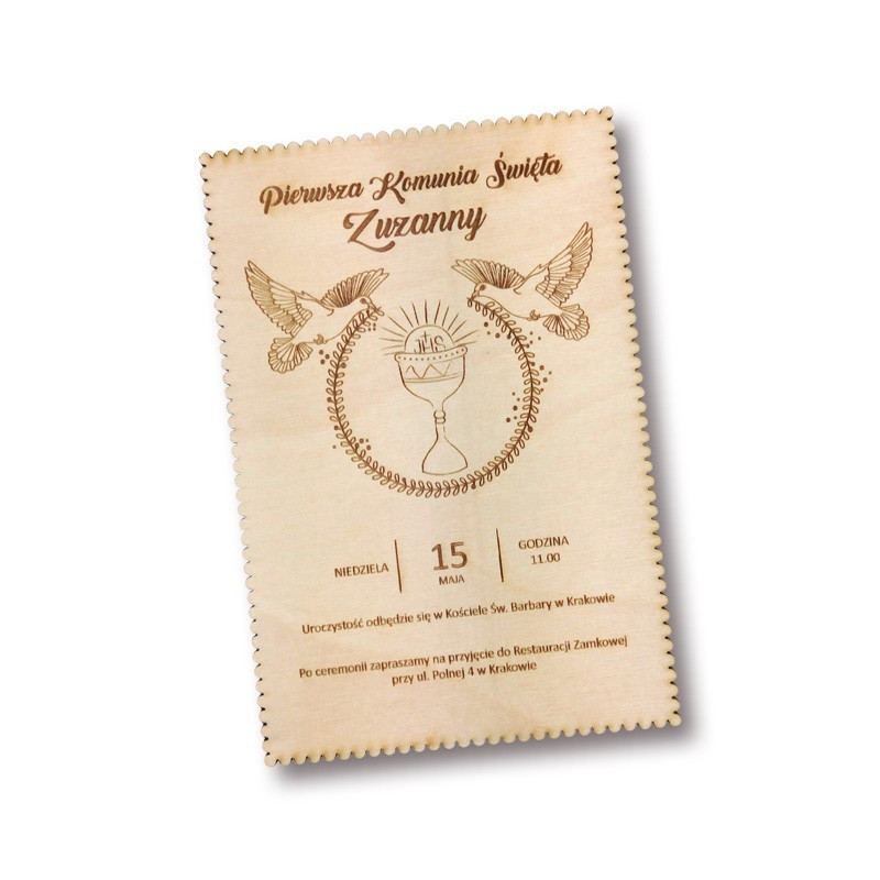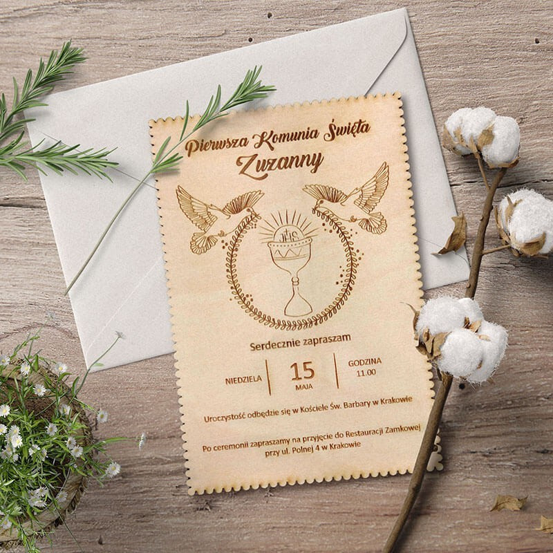 Planujesz uroczystość Pierwszej Komunii Świętej Twojego dziecka? Szukasz eleganckich i wyjątkowych zaproszeń, które zostaną zapamiętane na długo? Mamy dla Ciebie idealne rozwiązanie! Nasze zaproszenia z okazji Pierwszej Komunii Świętej. Wykonane są z drewnianej sklejki sosnowej, są niezwykle efektowne i przyciągające wzrok. Dodatkowo, możemy je spersonalizować, aby nadać im jeszcze więcej uroku i wyjątkowości. Jesteśmy przekonani, że Twoi goście będą zachwyceni!