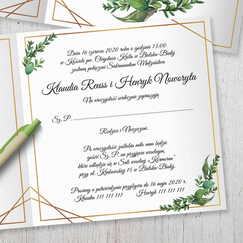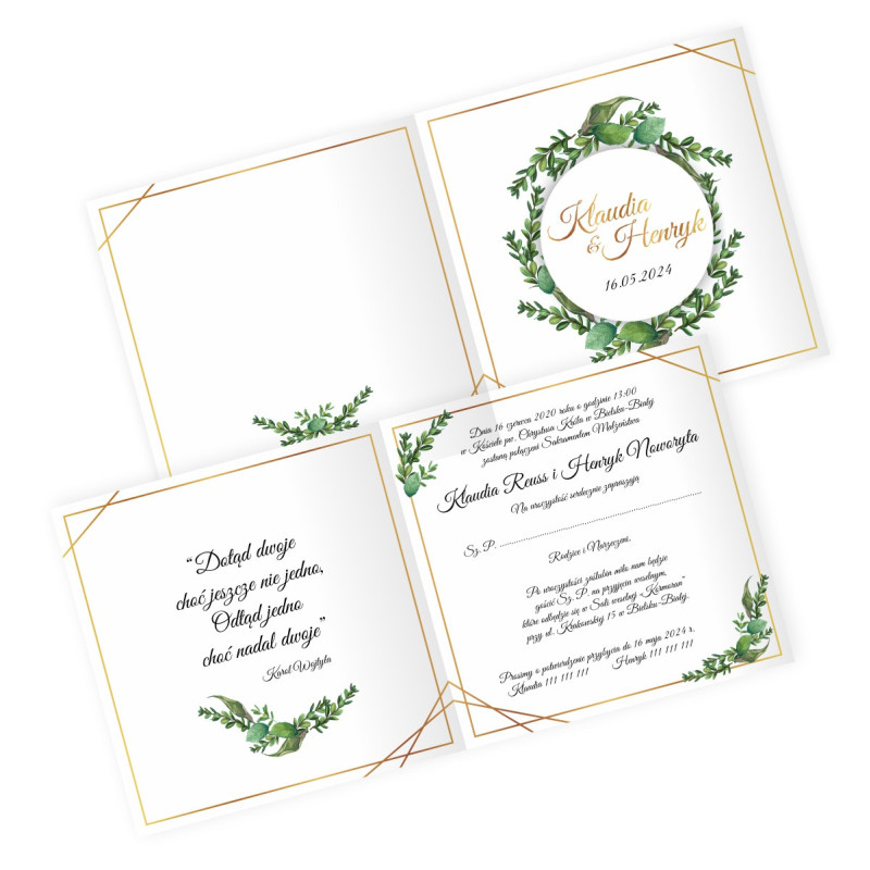 Zaproszenie ślubne rustykalne, geometryczne - eukaliptus, zielone liście.