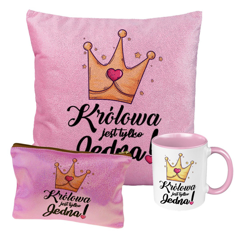 Zestaw prezentowy brokatowa poduszka z napisem, kosmetyczka oraz kubek "Królowa jest tylko jedna".